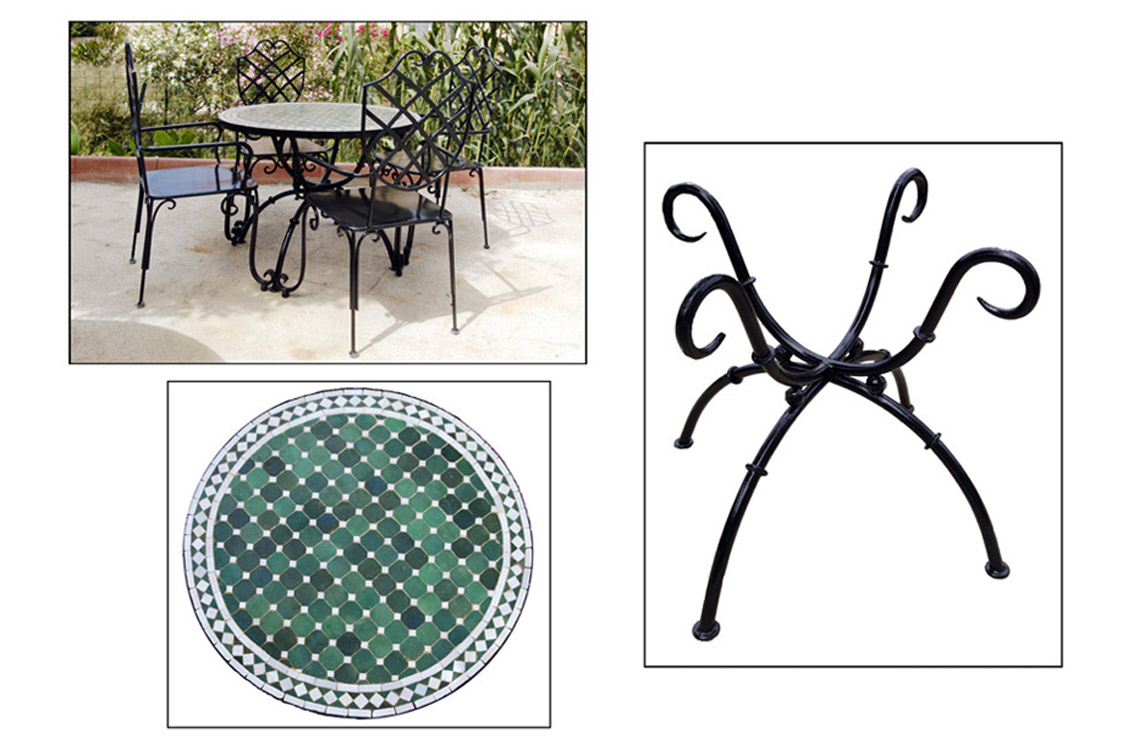 Table zellige format terrasse de café avec son support massif ,liée a ses chaises . Un mois de délai est nécessaire pour toute fabrication de table zellige .